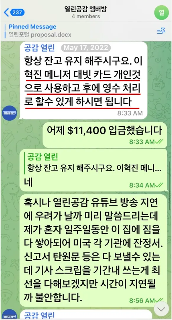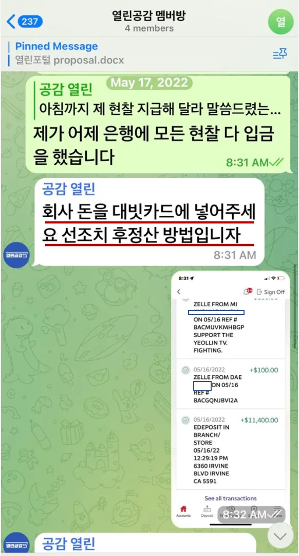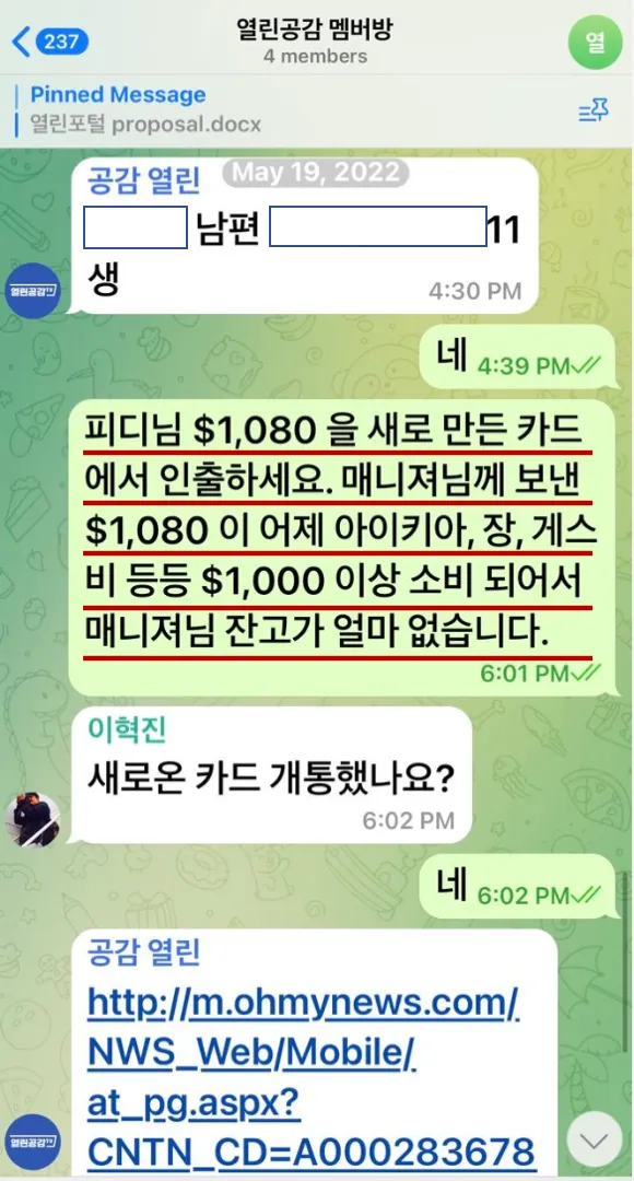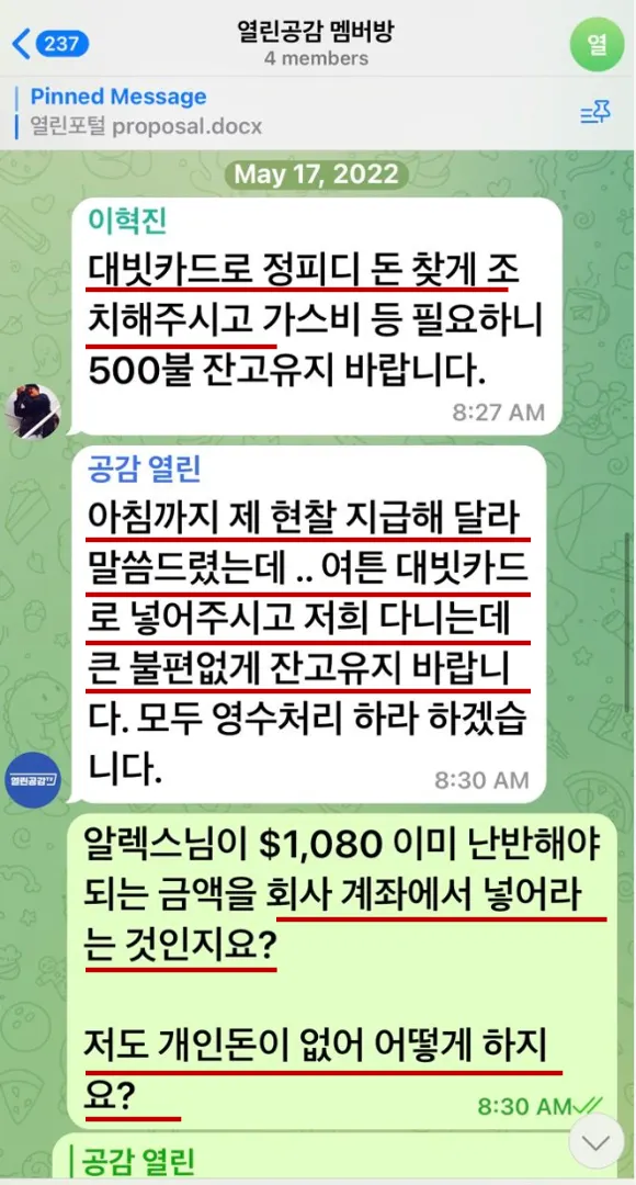 ”아침까지 제 현찰 지급해 달라 말씀드렸는데. 회사 돈을 데빗카드에 넣어주세요. 선조치 후정산 방법입니다. 이혁진 매니져 데빗카드 개인것으로 사용하고 후에 영수처리 할 수 있게 하시면 된다”