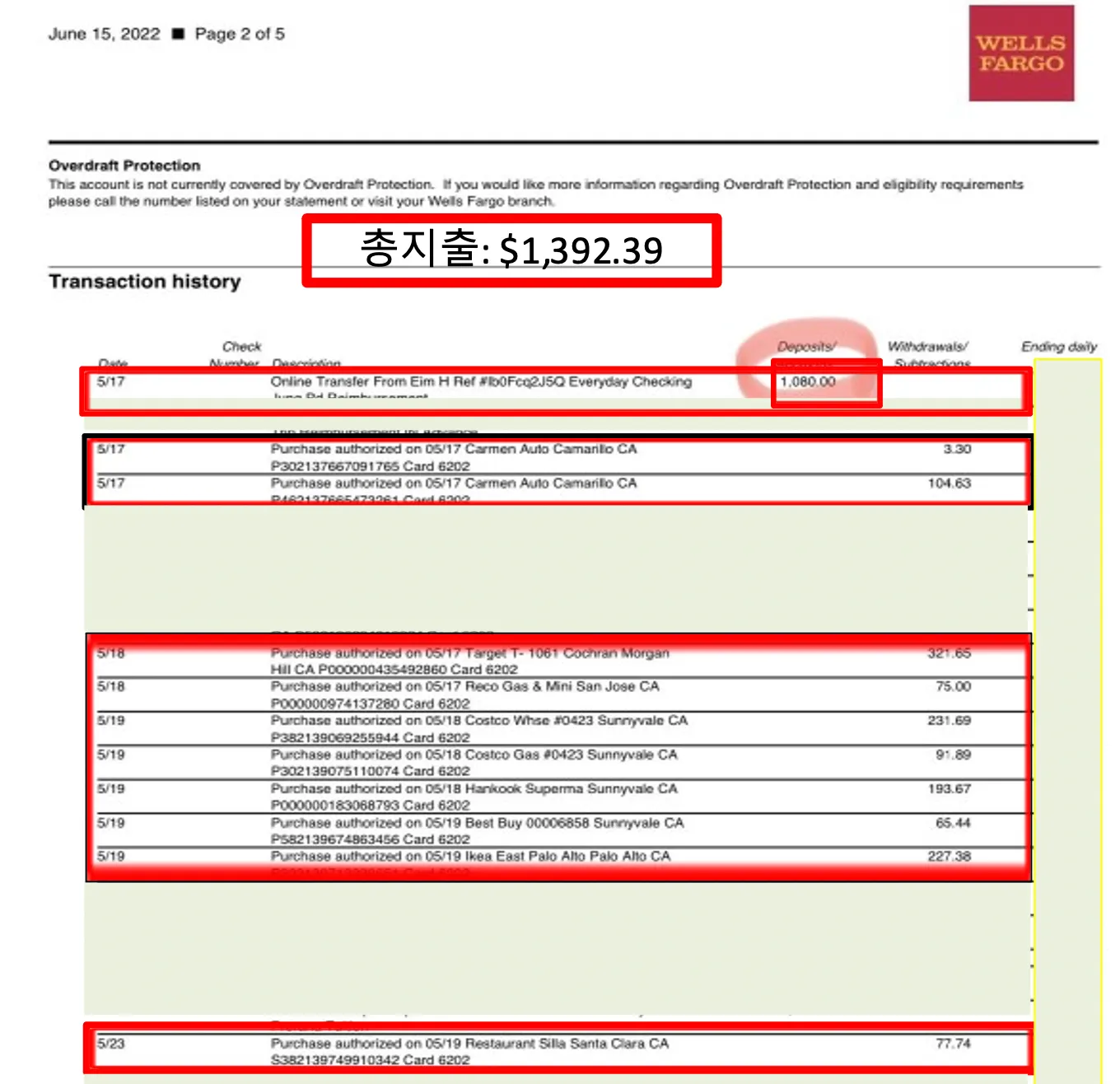 5월9일 이혁진의 얼바인 집으로 돌아와서 5월10일 Wells Fargo 은행 계좌를 오픈했으나, 미국은 데빗카드(체크카드)가 집으로 배달되는 시간이 1주일 이상은 걸리기 때문에 기금카드를 바로 사용할 수는 없었다.