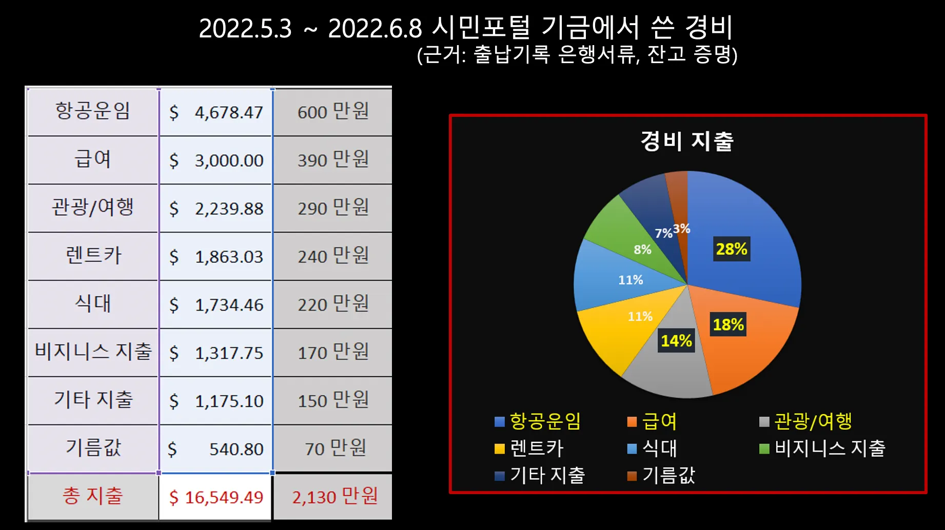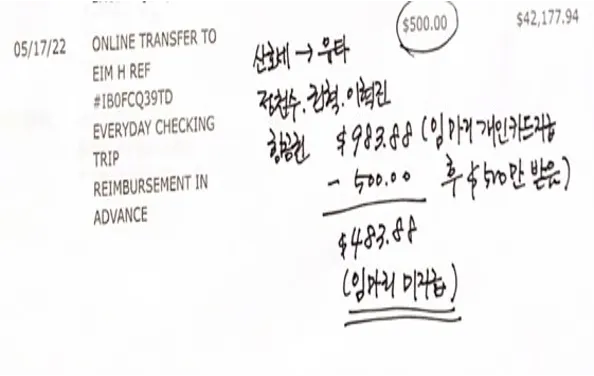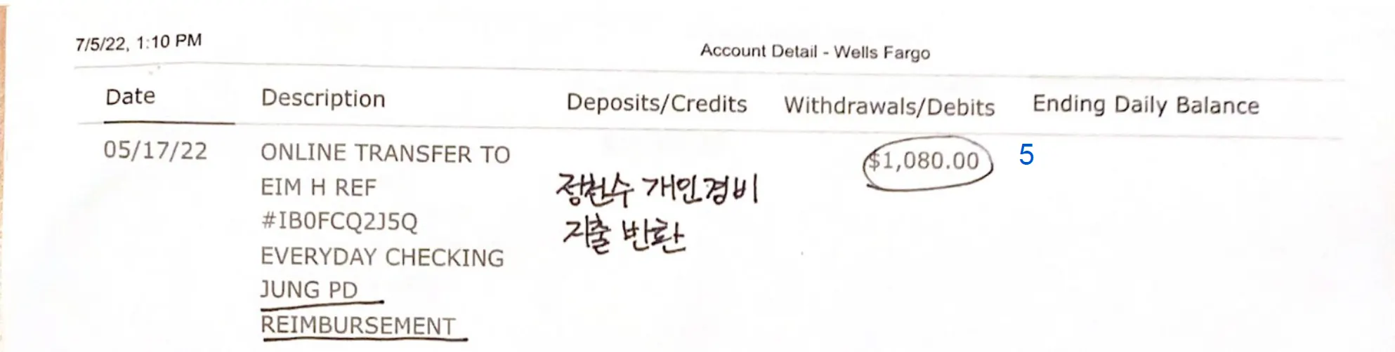 정천수는 미국에 도착해서 여행부터 체류하는 비용까지 기금에서 사용을 하였고, 또한 많은 경우 교민들의 호의로 숙식을 해결하였다. 그럼에도 불구하고 자신의 방송에서 모든 돈을 이혁진 임마리가 사용하였다고 거짓을 말하고 있다. 정천수를 bank statement를 보고 무슨 돈이 어떻게 사용되었는지 제대로 분석해보길 바란다.
