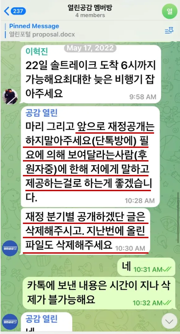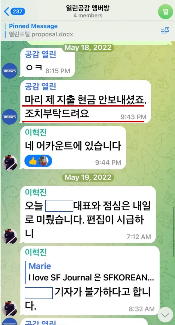 임마리는 시민포털과 관련이 없는 취재를 위해서 사용한 정천수 사비를 기금에서 정산 요청하는 정천수가 이해되지 않았다고 한다. 임마리는 정천수가 한국에서 5억정도를 가져오겠다고 말했었기 때문에 정천수가 시민포털과 상관없는 취재 및 여행경비를 기금에서 사용한 것은 나중에 정산하리라고 생각했다고 한다. 그래서 회계장부를 기재하면서 “정천수 생활비” 항목으로 분류하여 경비를 기재하였다. 6월8일 정천수가 몰래 기금인출을 시도하는 와중에 정천수는 임마리에게 회계장부를 정리해 줄것을 급하게 요청하였고, 이때 “생활비”항목을 “운영비”로 변경해달라고 요청하였다.