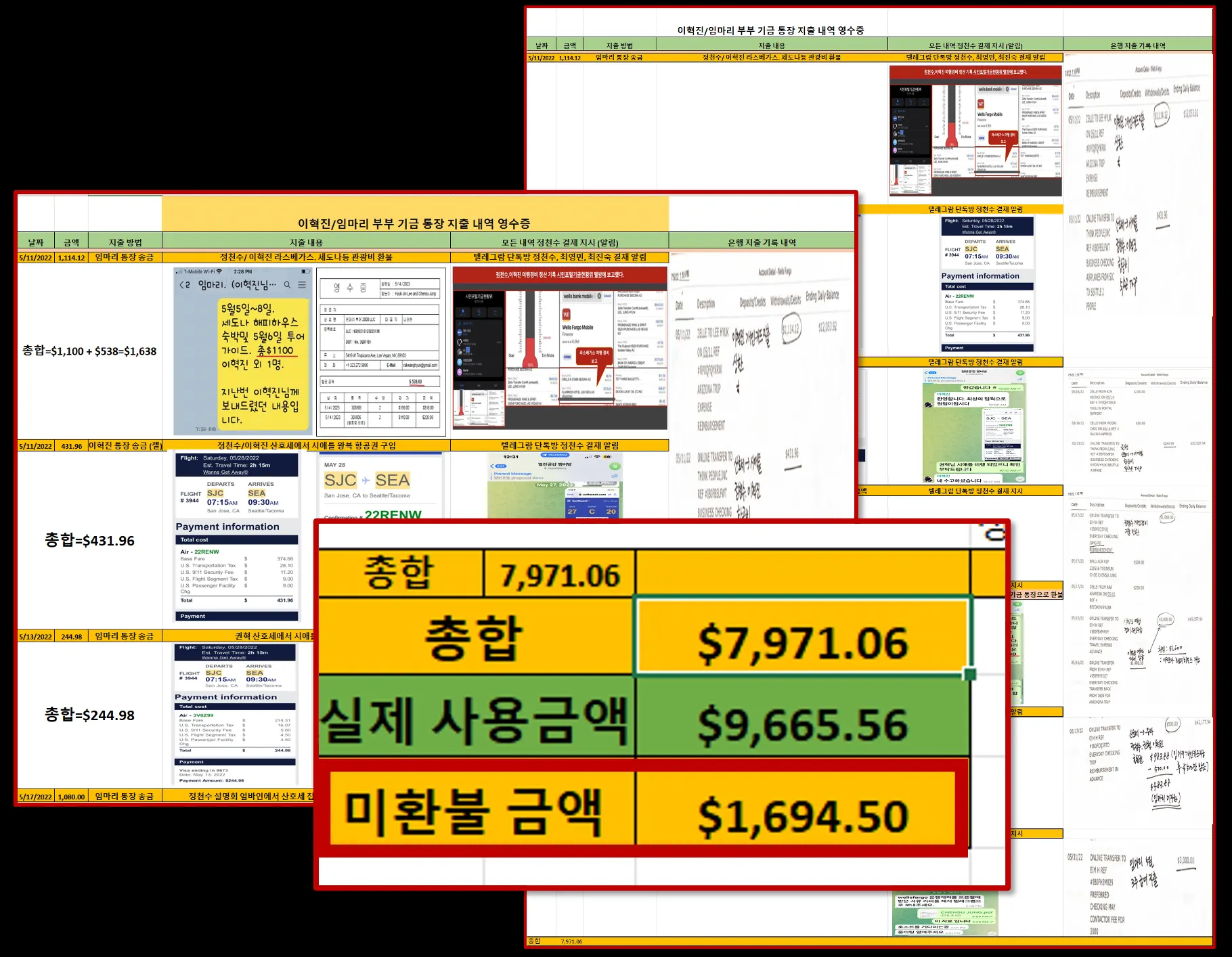실제 사용금액 $9665.56 - 정산받은 금액 $7971.06 = 정산받지 못한 금액 $1694.50