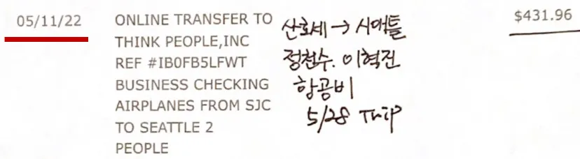 5월17일 이혁진, 정천수, 권혁이 산호세로 이사를 먼저 하면서, 경비사용 수단을 이혁진의 데빗카드로 했다.