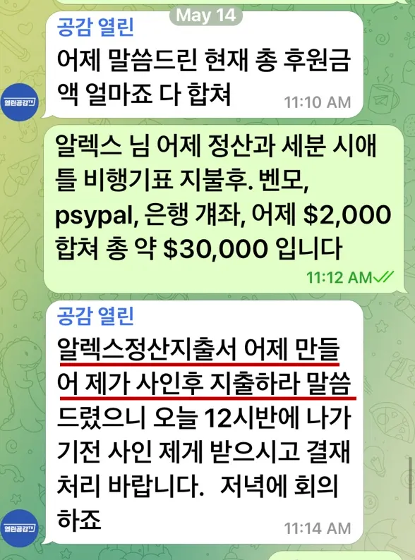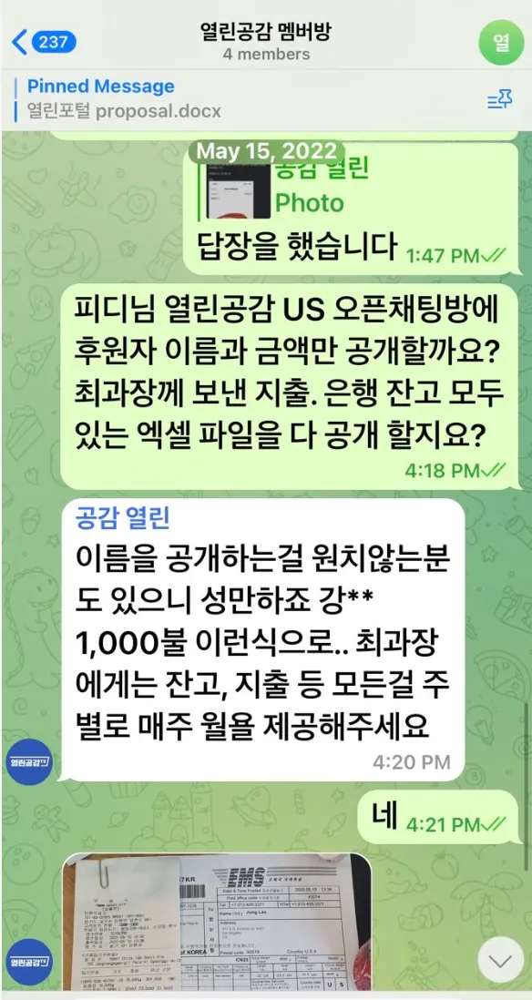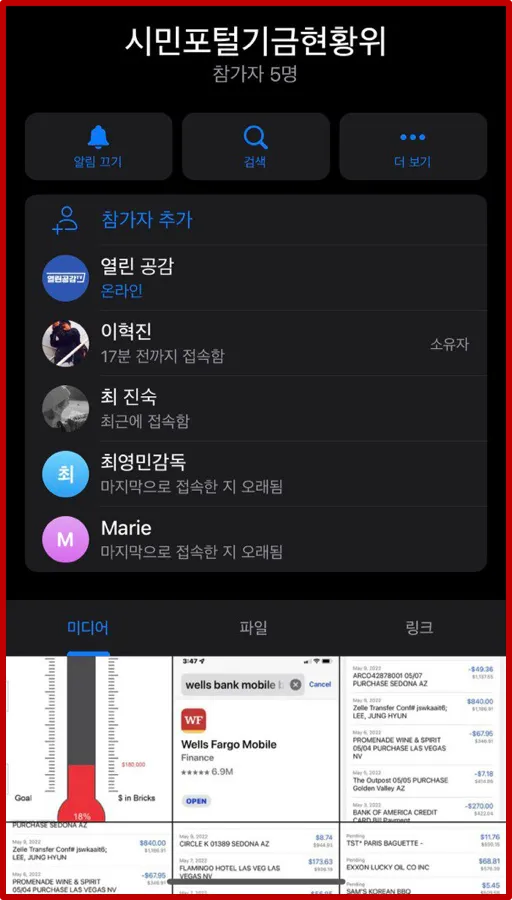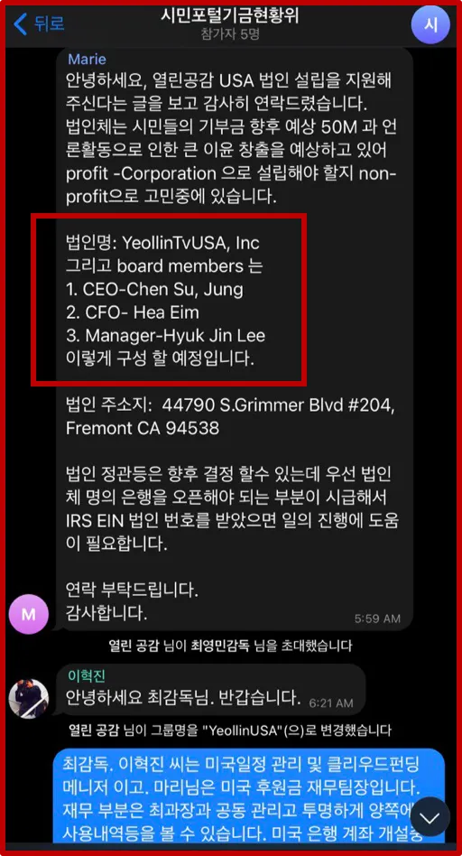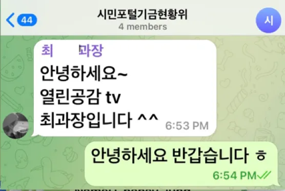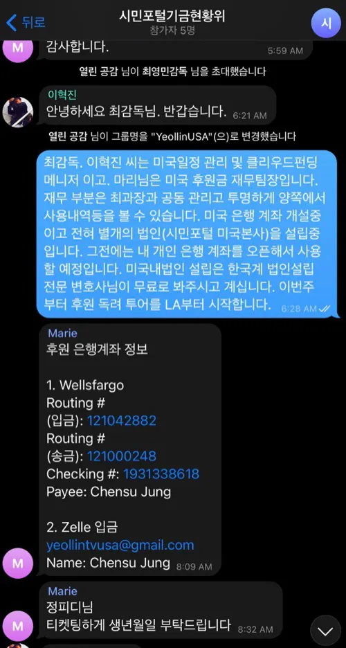 정천수는 시민포털기금현황위 텔레그램방을 개설하여 한국 열린공감TV의 최영민 감독과 회계담당 최과장을 참여시켜, 미국에서의 기금모금현황 회계자료를 공유하게 하였다.