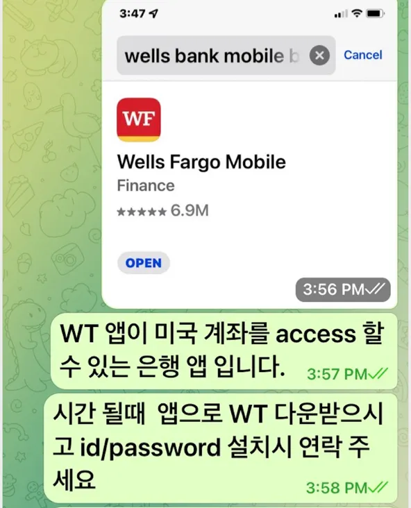 5월15일 임마리는 Wells Fargo 은행 app 설치를 최진숙 과장에게 안내하고, 아이디와 비밀번호를 공유하였다.