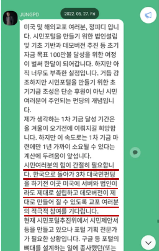 법인설립을 진행중이고 공익법인부터 설립될 것이고 15일정도 소요될 것이라며 공지했던 내용과는 다르게 5월27일 공지에서는 기금이 모아져야 법인설립이 가능할 것처럼 언급한다. (⇒ 법인설립을 먼저하고 그 법인에서 기금모금을 진행했어야 맞는 순서였다.)
