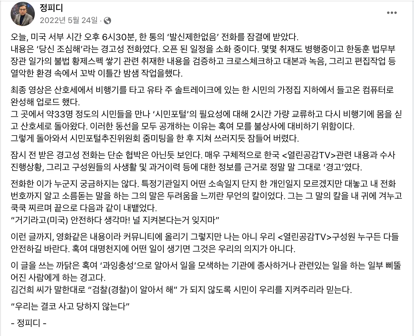 - 정천수는 자신의 페이스북에 협박전화 관련 글을 올리고