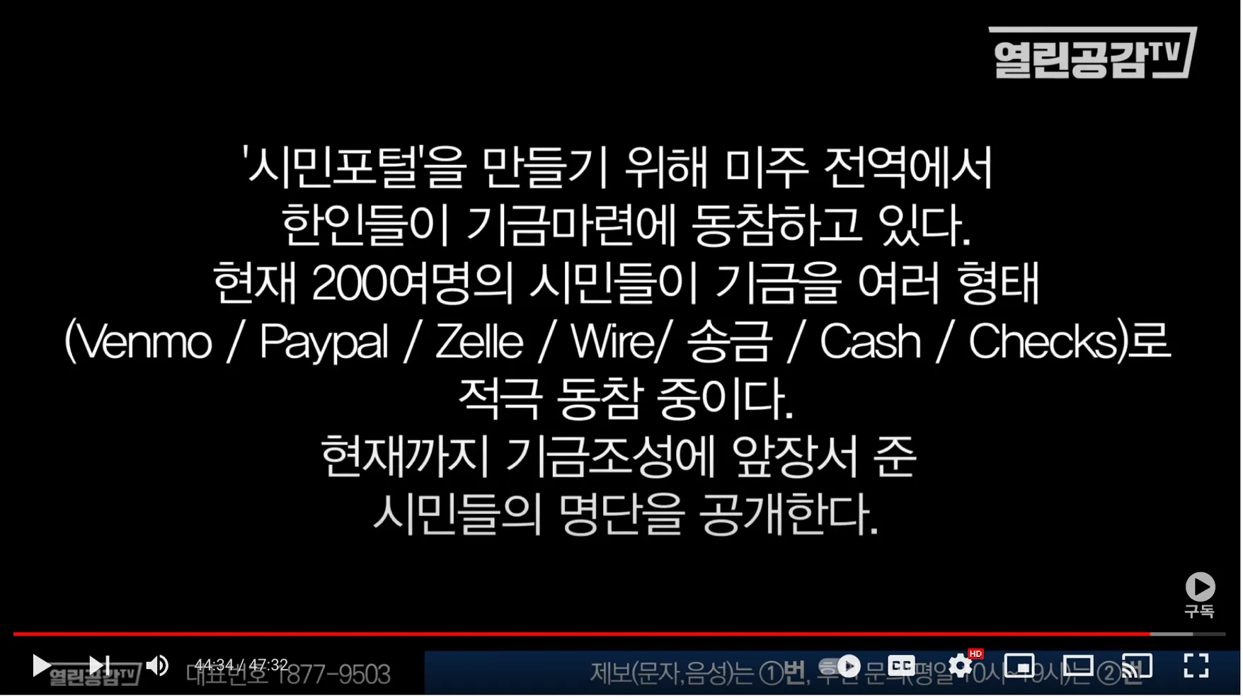 정천수는 단지 열린공감TV 방송을 이용하여 자신이 한 방송의 끝에 기금을 낸 사람들의 이름을 나열하여 보여주며, 기금을 낸 분들에게 자신이 현재 해줄수 있는 것이 이 방법이라며, 지속하여 교민들을 기망하였다.