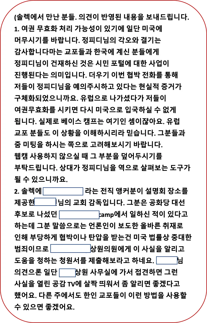 미성년 성매매 등 과거 자신의 개인적 일탈로 인한 검찰수사를 두려워한 사유로 미국으로 도피하고도 정치적 박해를 받고 있는 것처럼 자신의 상황을 교민들에게 적극적으로 알리고, 망명까지 알아보고 있던 정천수는 2022년 5월27일 열린공감TV 공지방에 다시 기금모금을 호소하는 글을 올리며 교민들을 기망했다. 정천수가 교민들에게 적극적으로 알린 협박전화는 정천수가 정치적 박해를 받고 있다는 상황을 더욱 드라마틱하게 만들어주었고, 교민들이 정천수의 망명을 직접적으로 돕기위한 행동을 하도록 만들었다.