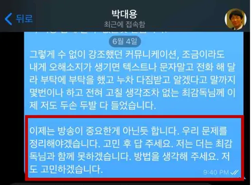 6월4일부터 정천수는 최영민과의 결별을 결심한 듯한 발언을 계속한다.