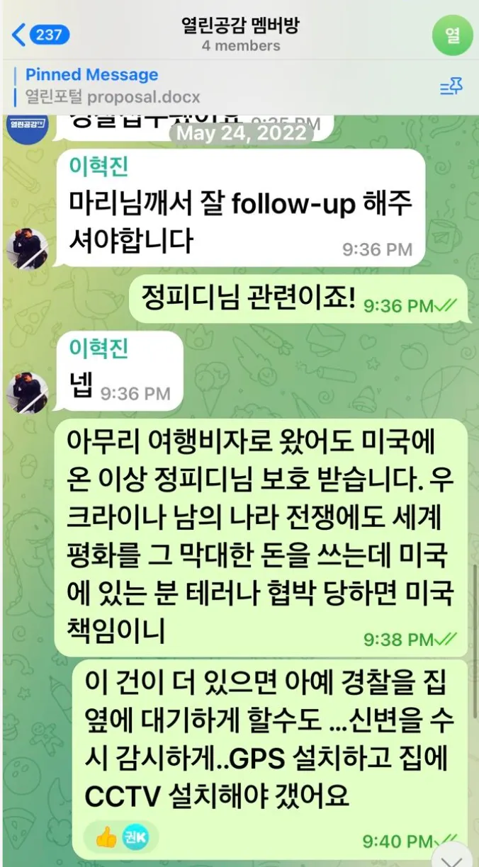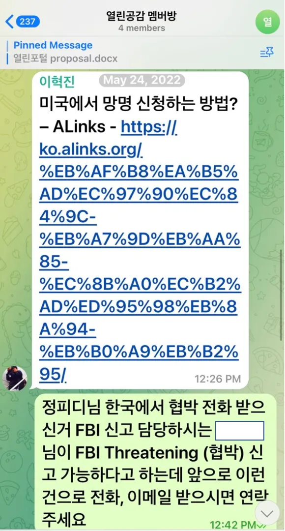 이혁진은 5월24일 미국에서 망명신고하는 사이트 링크를 정천수에게 공유해주었다.