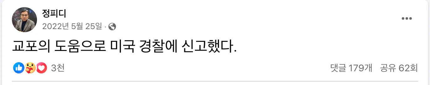 나파벨리 거주 교민께서 정천수가 받았다는 협박전화를 미국경찰에 신고해 주었다.