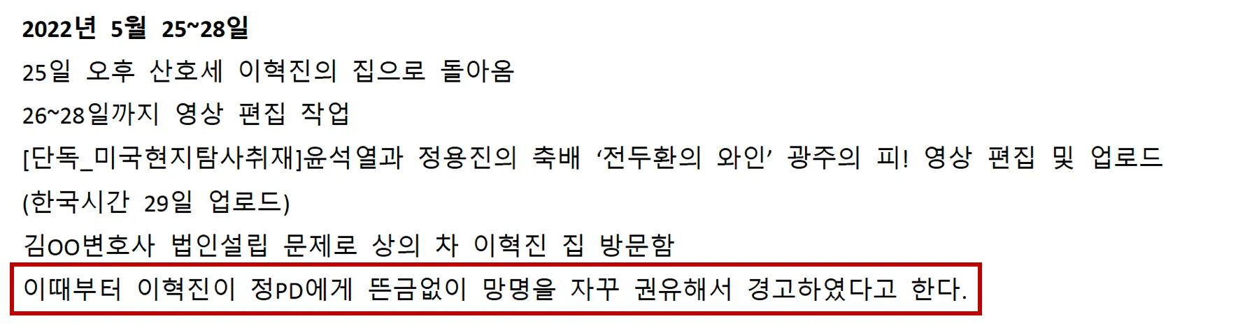 이혁진이 뜬금없이 망명을 자꾸 권유해서 경고하였다고 기록하고 있다. 또한 자신의 방송에서 같은 내용을 언급하였다.