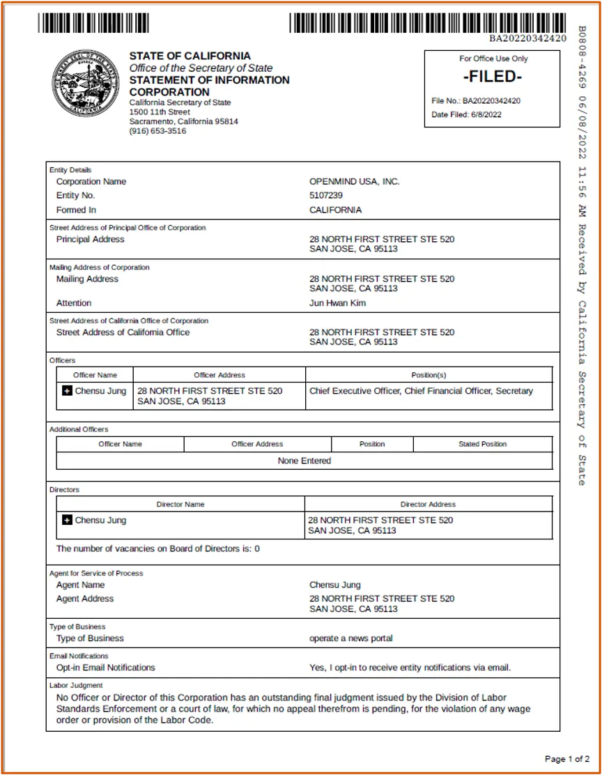 그러나 정천수는 기금모금 중단 요청을 거부하고, 법인설립을 몰래 진행하였고 6월8일 정천수 단독지분의 영리법인 “OPENMIND USA, INC” 설립을 완료했다.