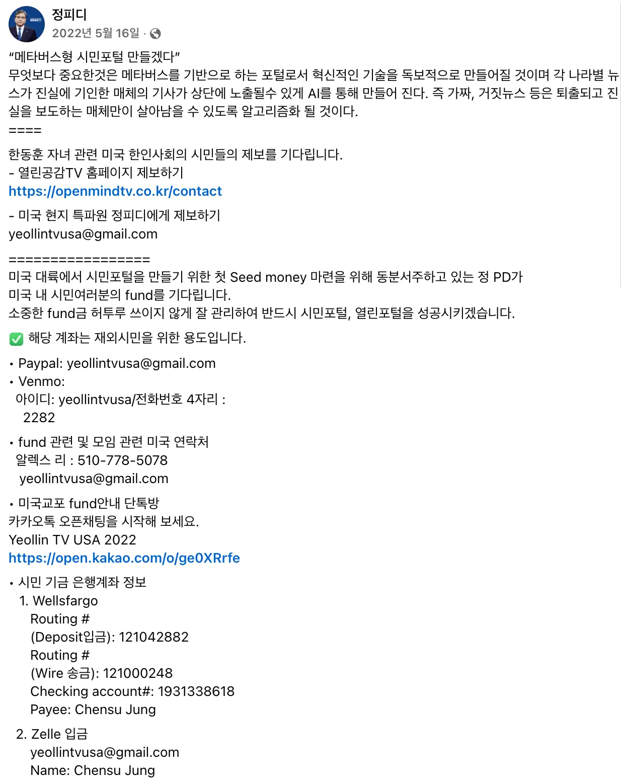 정천수 페이스북 (2022년 5월16일(미서부)) 정천수의 말
