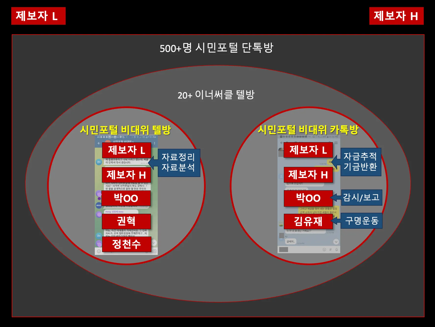 시민포털에 관심을 가지고 있던 교민들이 “열린공감TV 공지방” 이라는 단톡방에 500여분 모여있었다. 정천수를 돕고있던 박OO 교민이 이들 중에서 선별해서 텔레그램방으로 초대를 했다. 20여분이 그 텔레그램방에 모였고, 정천수가 제공한 자료들을 접하게 되었고, 일방적인 정천수의 말과 그 자료들을 근거로 하여 의견들을 교환하였고, 오해가 있어서 열린공감TV 한국 이사진들과 충돌이 발생했다 판단하여 진실을 알려서 사태가 빨리 수습되기를 바라며, 대책을 마련하고 행동하는 역할들을 하였다. 그 20여분 중에서 제보자L과 H, 현재 열린공감TV의 대표이사가 된 김유재, 이들을 모은 박OO 은 정천수, 권혁과 소통하며 별도의 카톡방과 텔레그램방에서 중요업무들을 하였다.